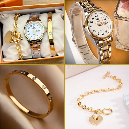 Ensemble de Luxe OLEVS : Montre Femme et 2 Bracelets en Acier Inoxydable Plaqué Or 18K