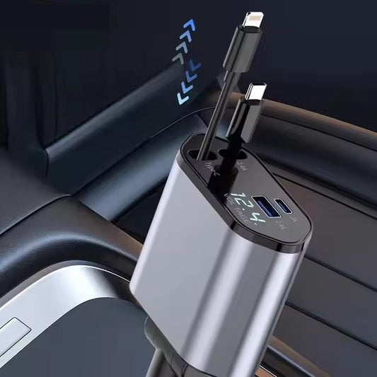 Chargeur de Voiture Rétractable 4 en 1, 120W, Charge Rapide USB-C & USB-A, avec 2 Câbles Rétractables – Compatible iPhone, Samsung, Google et autres