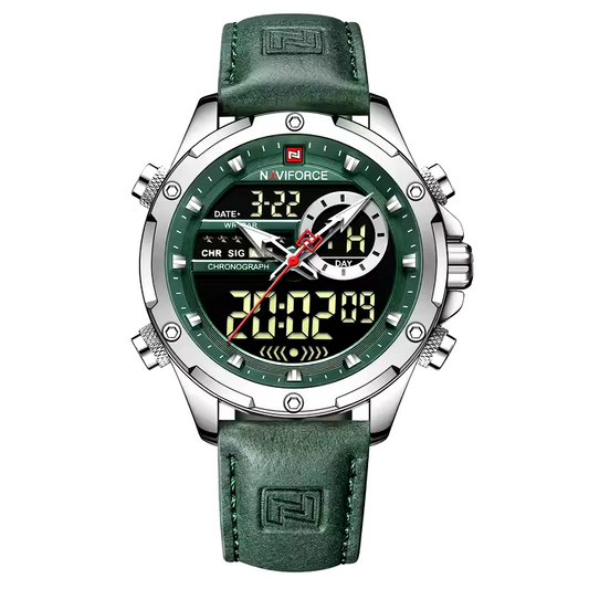 Montre militaire sportive pour homme - Étanche, Multifonction, Chronographe avec bracelet en cuir vert militaire